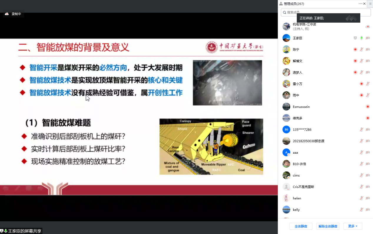 王家臣首先介绍了近几十年来我国放顶煤开采技术的科技发展历程,然后从图像识别智能放煤技术的背景及意义、煤矸图像智能识别、矸石体积建模计量、智能放煤技术开发以及创新点和主要成果等方面,详细汇报了团队近年来在放煤智能识别方面所积累的相关技术,指出目前我国智能化放煤技术水平在国际上处于前列。