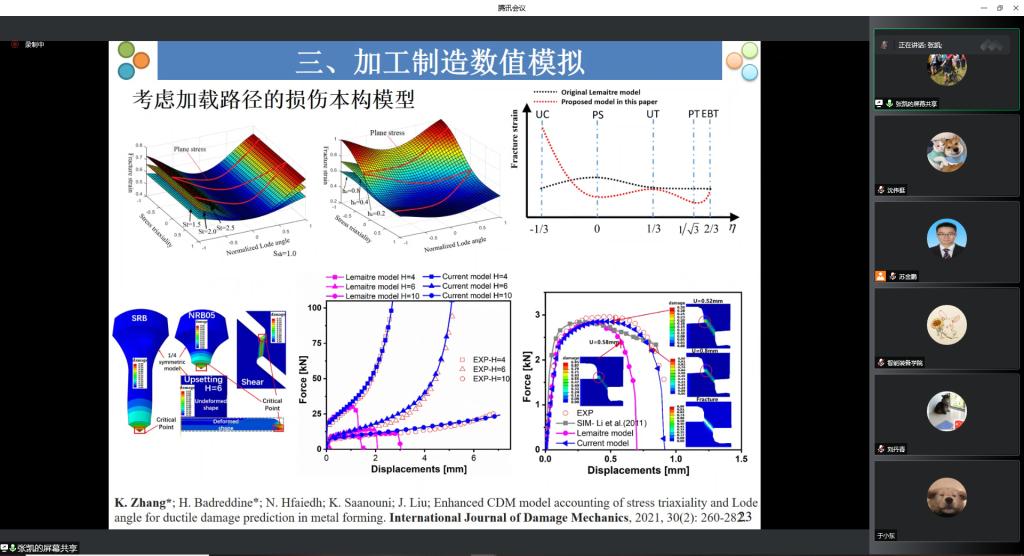 然后,会议进入第一阶段引导报告。张凯博士就“先进弹塑性损伤本构建模及其在塑性成形中的应用”进行报告。他首先就先进制造技术进行了简要的介绍,随后详细讲解了弹塑性损伤力学理论,最后论述了加工制造过程的数值建模技术。朱然博士针对“高铁车头蒙皮的激光冲击成形研究”进行报告。他从发展激光冲击成形技术的重要意义、激光冲击成形建模方法、铝合金蒙皮激光成形技术及激光成形对结构表面质量和力学特性的影响等方面详细讲解了激光成形技术中的关键问题。