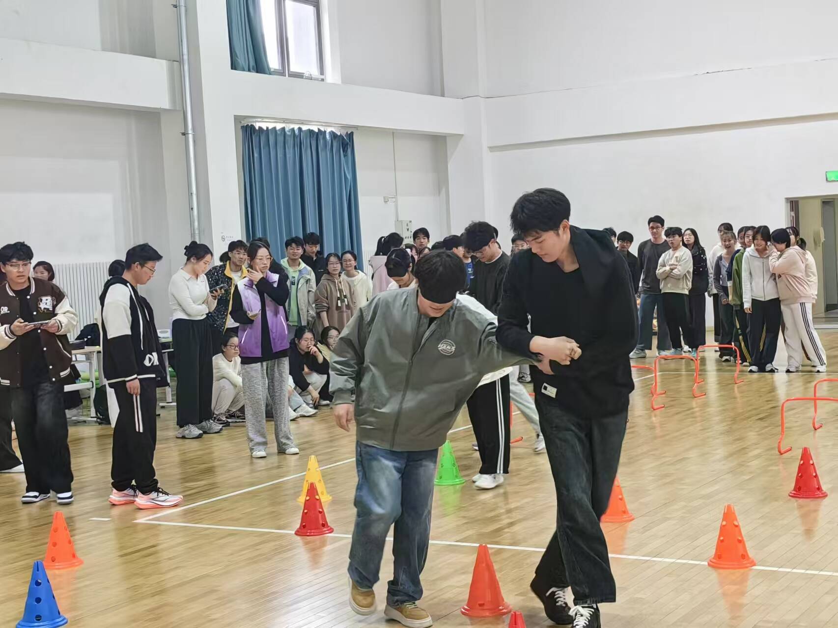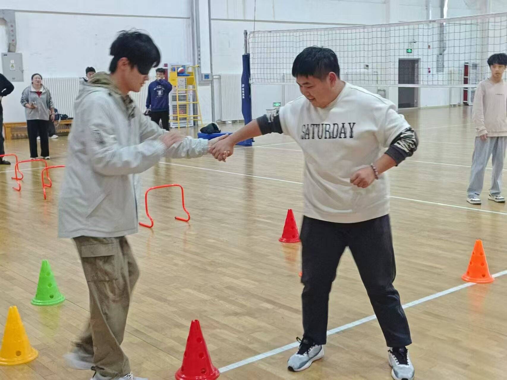 “盲人接力”环节中,同学们两两一组完美配合,体现出彼此的信任感和一致感。