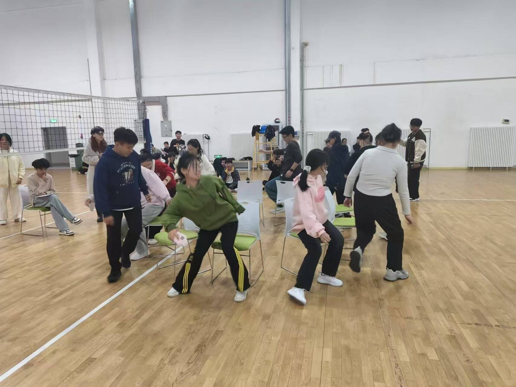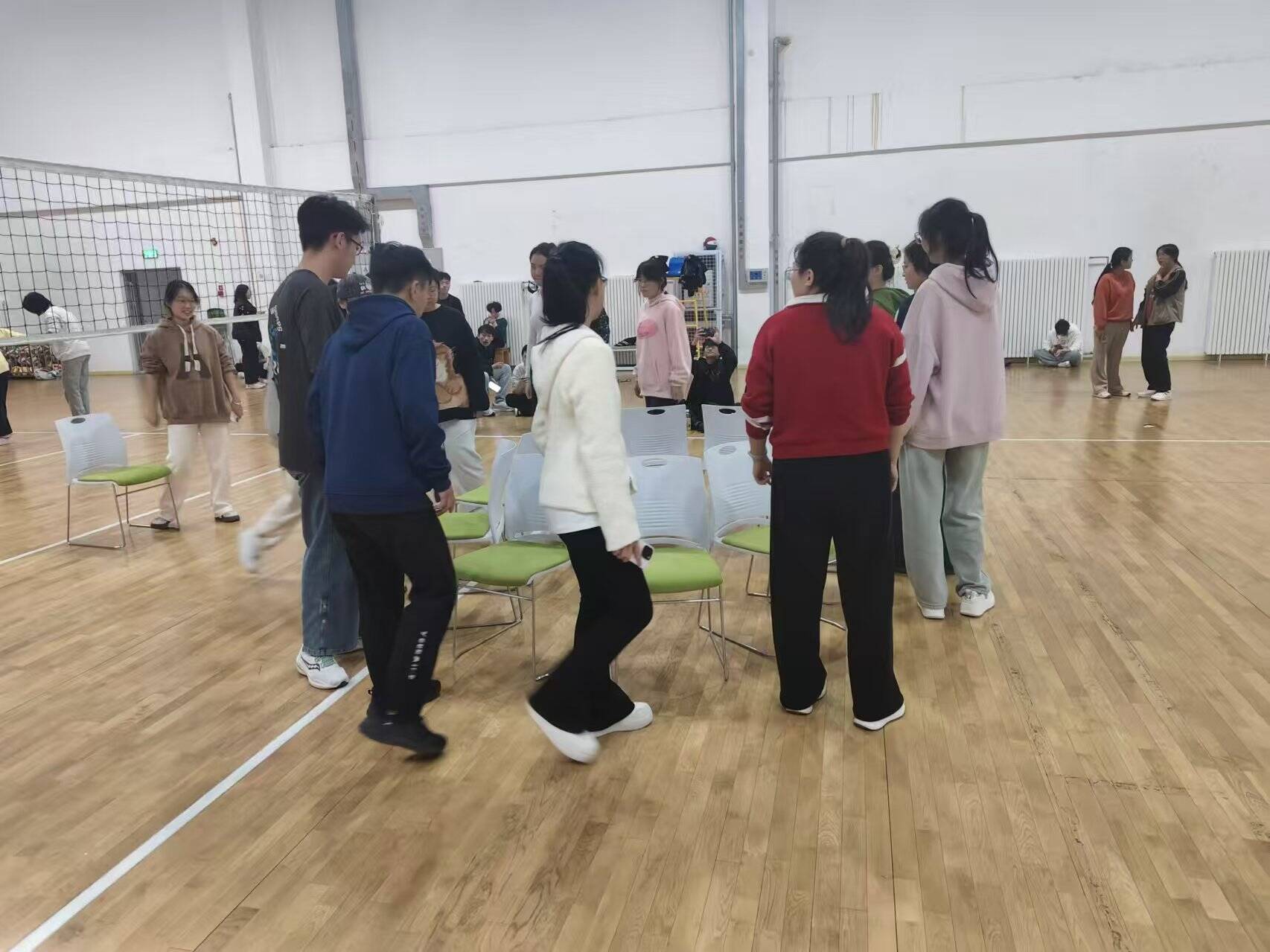 “抢椅子”环节中,大家围绕椅子伴着动感音乐快速转圈。这个活动充满乐趣和刺激,大家沉浸其中。