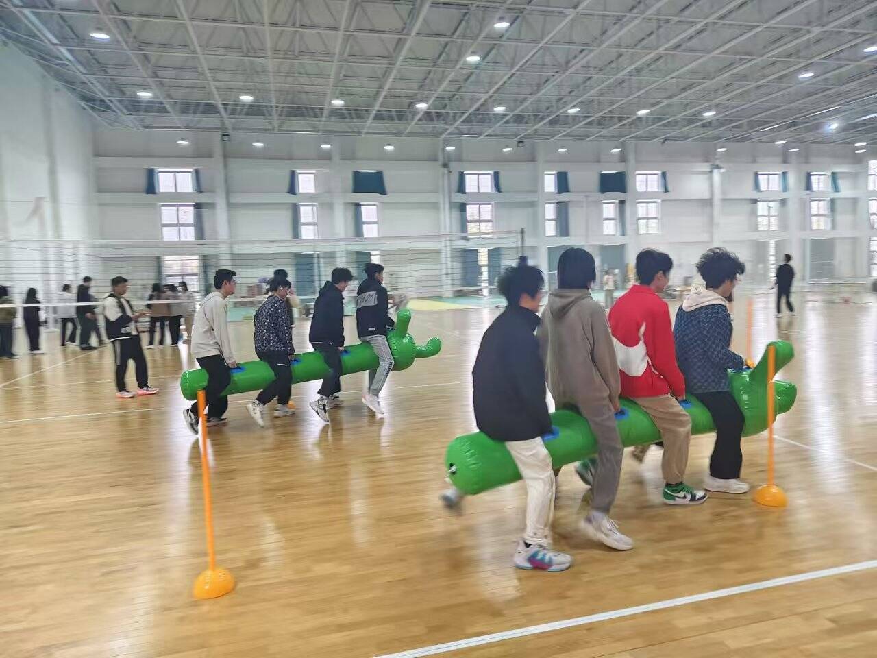 “毛毛虫”环节中,每队4人坐在毛毛虫上,大家步伐一致向前冲,此项目极其考验队员之间的默契与配合度。