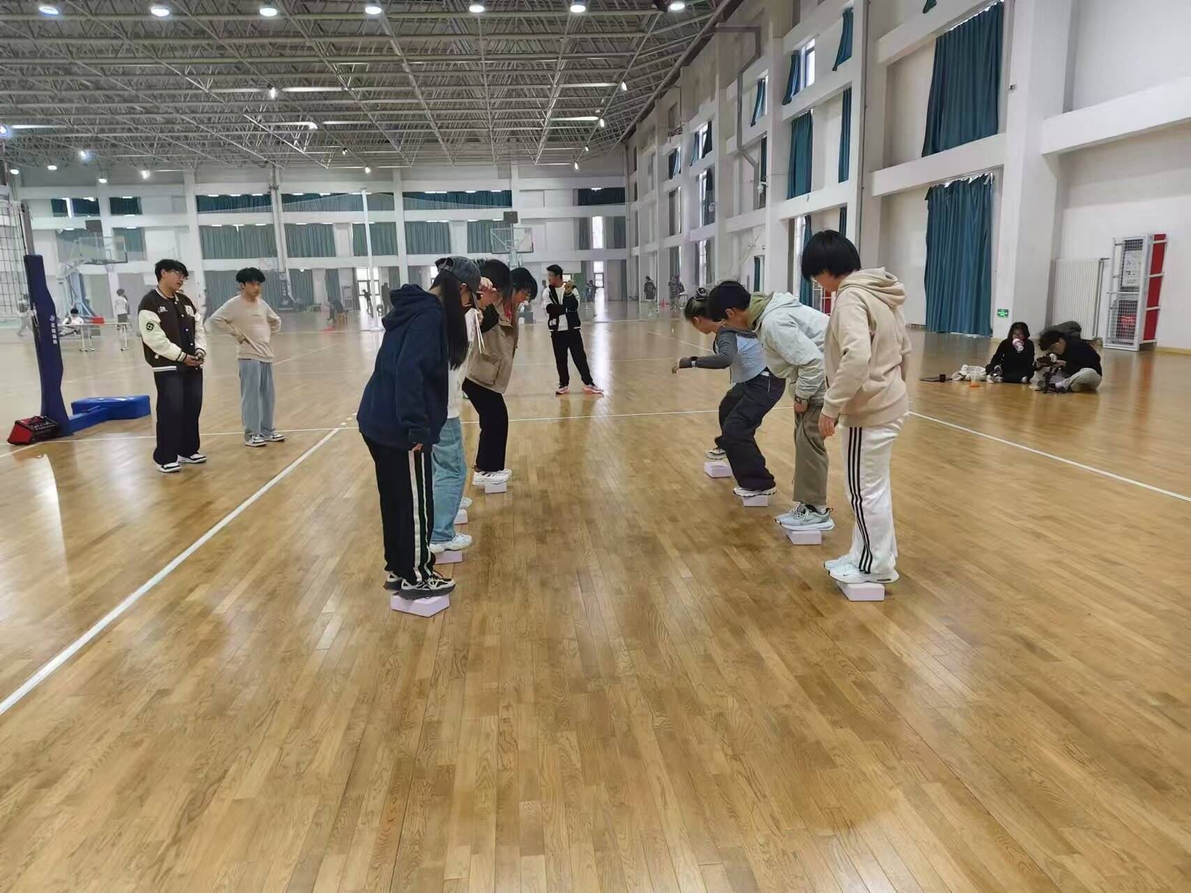 “摸石头过河”环节中,同学们精神抖擞,默契配合。这个游戏看似简单,实则需要良好的平衡感和节奏感。