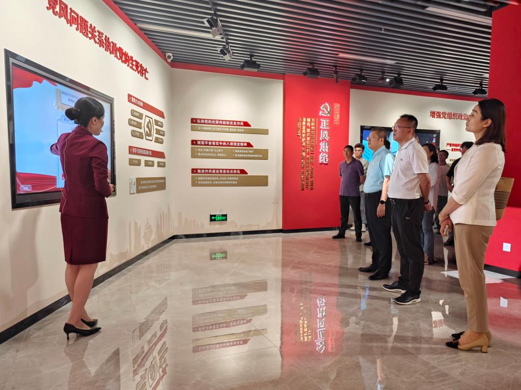 教育基地展厅分为“政治统领、理论武装、堪当重任、组织建设、正风肃纪、反腐攻坚、自我革命、党建引领”八大主题,伴随着讲解员的讲解,参观人员借助交互视频展示、VR互动等高科技多媒体技术,身临其境地学习中国共产党百年奋斗历程和重大成就。在“正风肃纪”主题部分,参观人员共同学习了《中国共产党纪律处分条例》的修订过程、意义和突出特点,并现场进行了《条例》知识测试。在“反腐攻坚”主题部分,共同观看了警示教育片,增强学纪、知纪、明纪、守纪意识,以案为鉴、以案明纪,切实筑牢拒腐防变的思想防线。