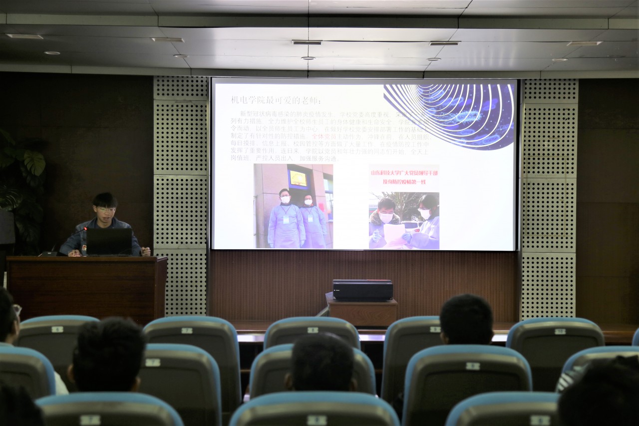 王正江介绍了beat365官方网站师生在疫情期间为学校、社区疫情防控进行的各项工作,特别讲述了机电学子在疫情期间积极参加各项志愿服务活动的优秀事迹,通过分享自身暑假时间到临沂市蒙阴县参加了“三下乡”社会实践活动,采访当地公安机关、社区网格化工作人员的所闻所感,向与会同学呈现了青年学子在疫情当中不畏艰险、共克时艰的精神。