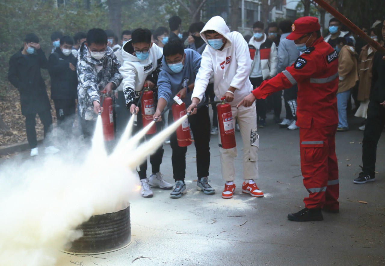 随后,在专业消防人员的指导下,同学们按照四人一组进行现场灭火演练,亲身学习了灭火器的操作步骤,掌握了快速高效的灭火技巧。