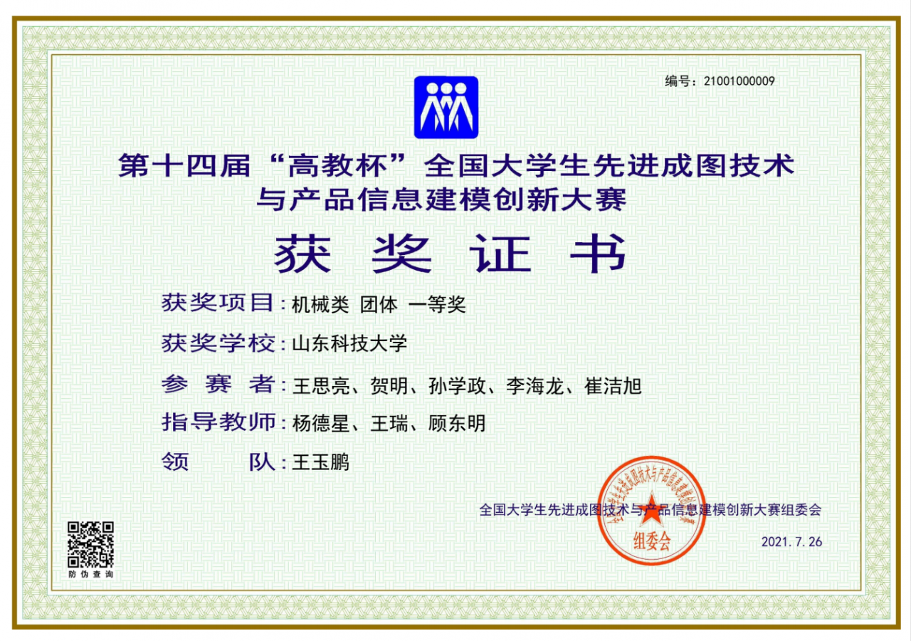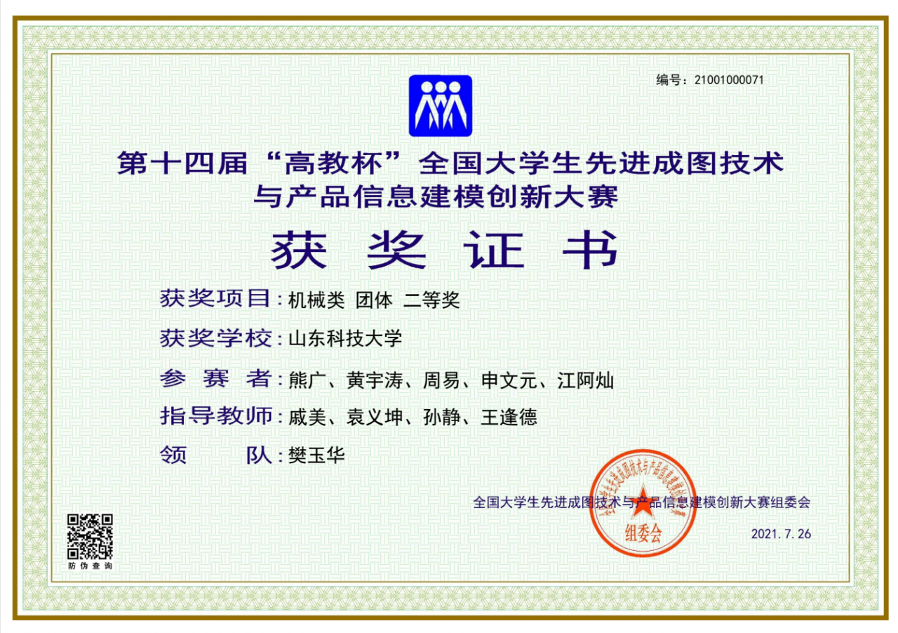点击:近日,由全国大学生先进成图技术与产品信息建模创新大赛组委会、中国图学学会制图技术专业委员会、中国图学学会产品信息建模专业委员会、西南交通大学共同主办的第十四届“高教杯”全国大学生先进成图技术与产品信息建模创新大赛在西南交通大学顺利落下帷幕。经过激烈角逐,beat365官方网站青岛校区荣获团体一等奖1项、二等奖1项、三等奖2项,个人一等奖24项、二等奖5项、三等奖6项,其中beat365官网荣获团体一等奖1项、二等奖1项、三等奖1项,个人一等奖24项、二等奖3项、三等奖1项。由王思亮、贺明、孙学政、李海龙、崔洁旭组成的机械类代表队(指导老师:杨德星、王瑞、顾东明,领队:王玉鹏)获得机械类团体一等奖,这是beat365官网连续七年获得机械类团体一等奖。同时由熊广、黄宇涛、周易、申文元、江阿灿组成的机械类代表队(指导老师:戚美、袁义坤、孙静、王逢德,领队:樊玉华)获得机械类团体二等奖。beat365官网还获得了制图基础知识一等奖1项、二等奖1项、三等奖1项,3D打印二等奖1项,inspire优化创新设计三等奖一项。同时,杨德星、王瑞、顾东明被评为“优秀指导教师”。
