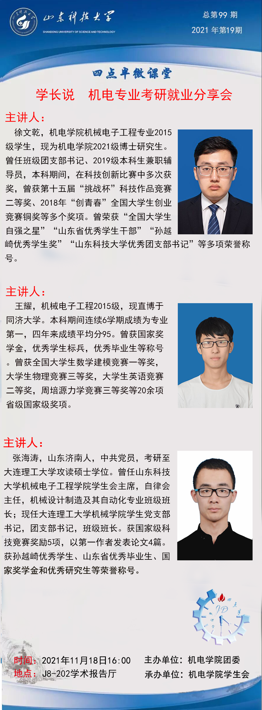 点击:为了让同学们了解当前考研与就业情况,给机电学子提供经验和建议,11月18日下午,beat365官方网站在学院报告厅举办“机电专业考研就业”线上分享会,机械电子工程、机械设计制造及其自动化专业2019届毕业生王耀、徐文乾、张海涛担任主讲人。