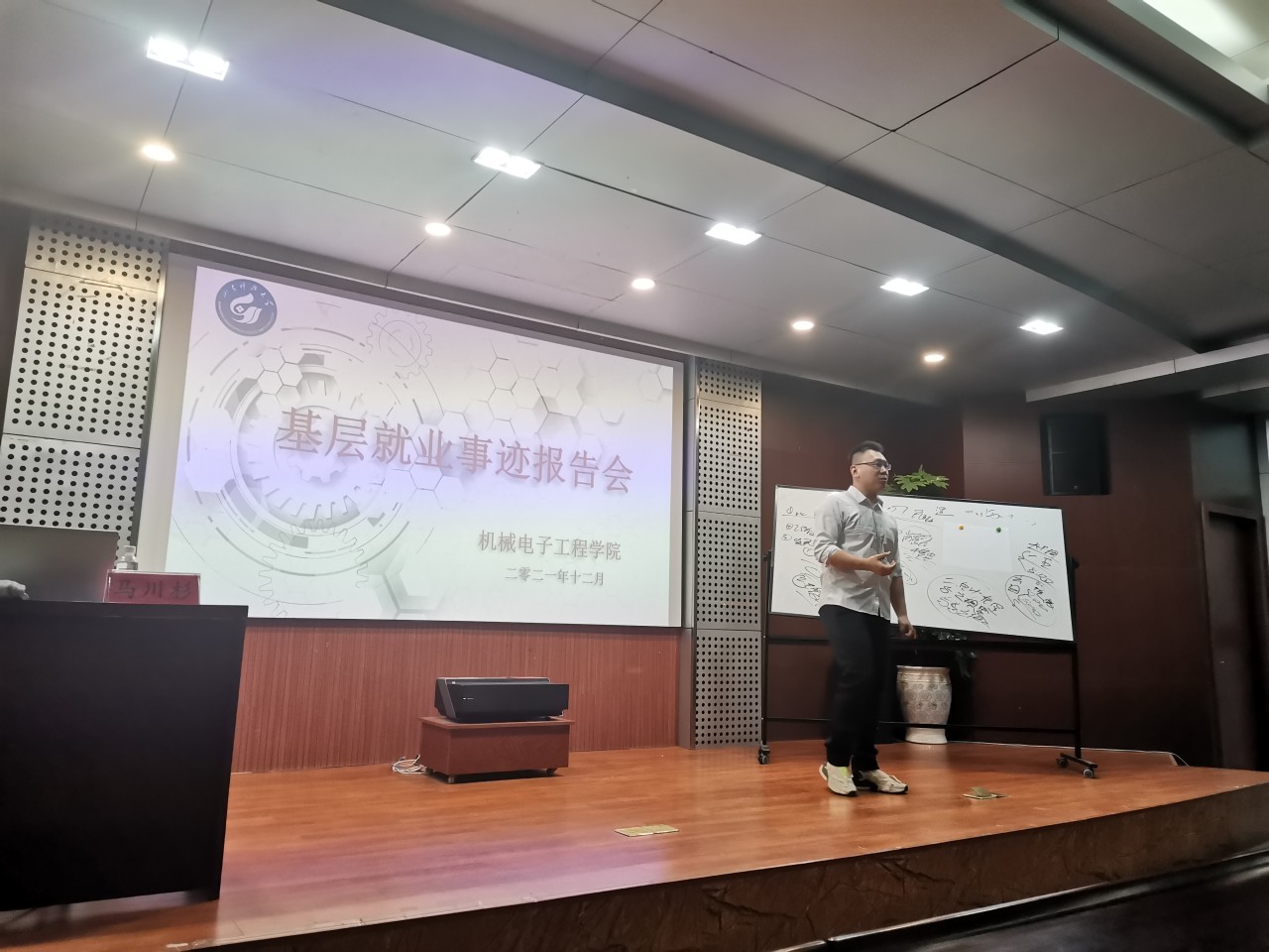 报告会上,马川杉、徐凯军深情讲述了他们在基层工作的心得体会与感悟。考取“青选计划”、用笔杆“挥毫”青春风采的马川杉展现了风趣幽默的人格魅力,向同学们讲述了他于工作期间如何独立发掘报送材料、获得市政府领导批示的经历,围绕备考“青选计划”,他详细向同学们介绍了青选计划的报考条件、岗位设置等内容。“如何撰写材料?”“青选计划是如何面试的?”……同学们踊跃提问,马川杉耐心解答,并通过板书标注重点。
