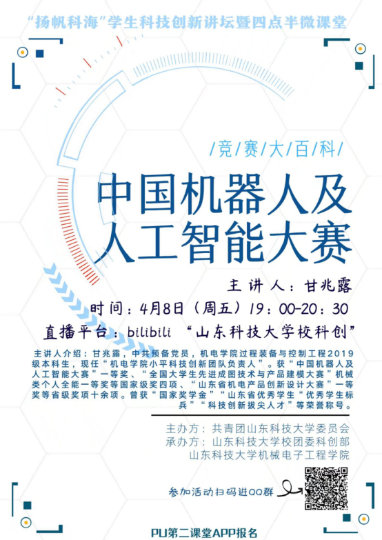 点击:为了激发同学们的科技创新热情,丰富相关专业知识和经验,4月8日晚上,beat365官方网站以直播形式举办“中国机器人及人工智能大赛”专题讲座。曾获得该赛事一等奖、小平科技创新团队负责人甘兆露担任主讲人。