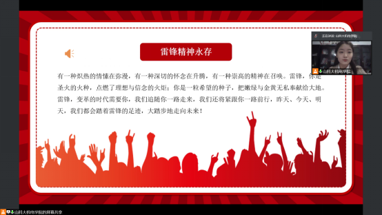 在此次的线上雷锋精神教育活动中,李菲介绍了雷锋的生平概况,让300余名中学生对雷锋精神有了更好的认识。通过系统的宣讲,教育并鼓励青少年积极学习雷锋精神,领悟雷锋精神的意义,营造学习雷锋精神的良好氛围。除了线上宣讲以外,本次活动还加入了线上连线讨论环节,与壤塘县中学师生代表进行连线讨论如何在日常的生活和学习中实践雷锋精神,鼓励引导学生做好事、做实事。